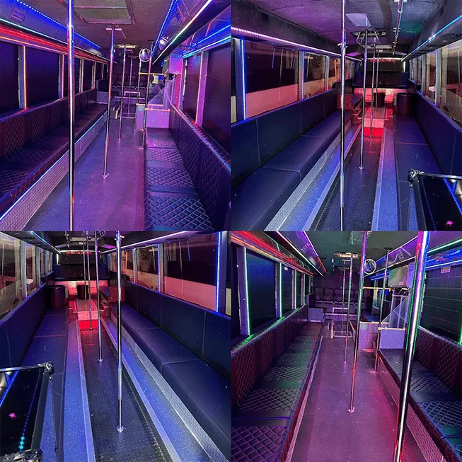 Step aboard our Limo Party Buses and enter a world of opulence. Our buses are meticulously designed with lavish leather seating, creating an atmosphere of elegance and comfort. The interior is adorned with captivating party lighting, featuring LED lights, strobes, and lasers, setting the stage for an electrifying party atmosphere.